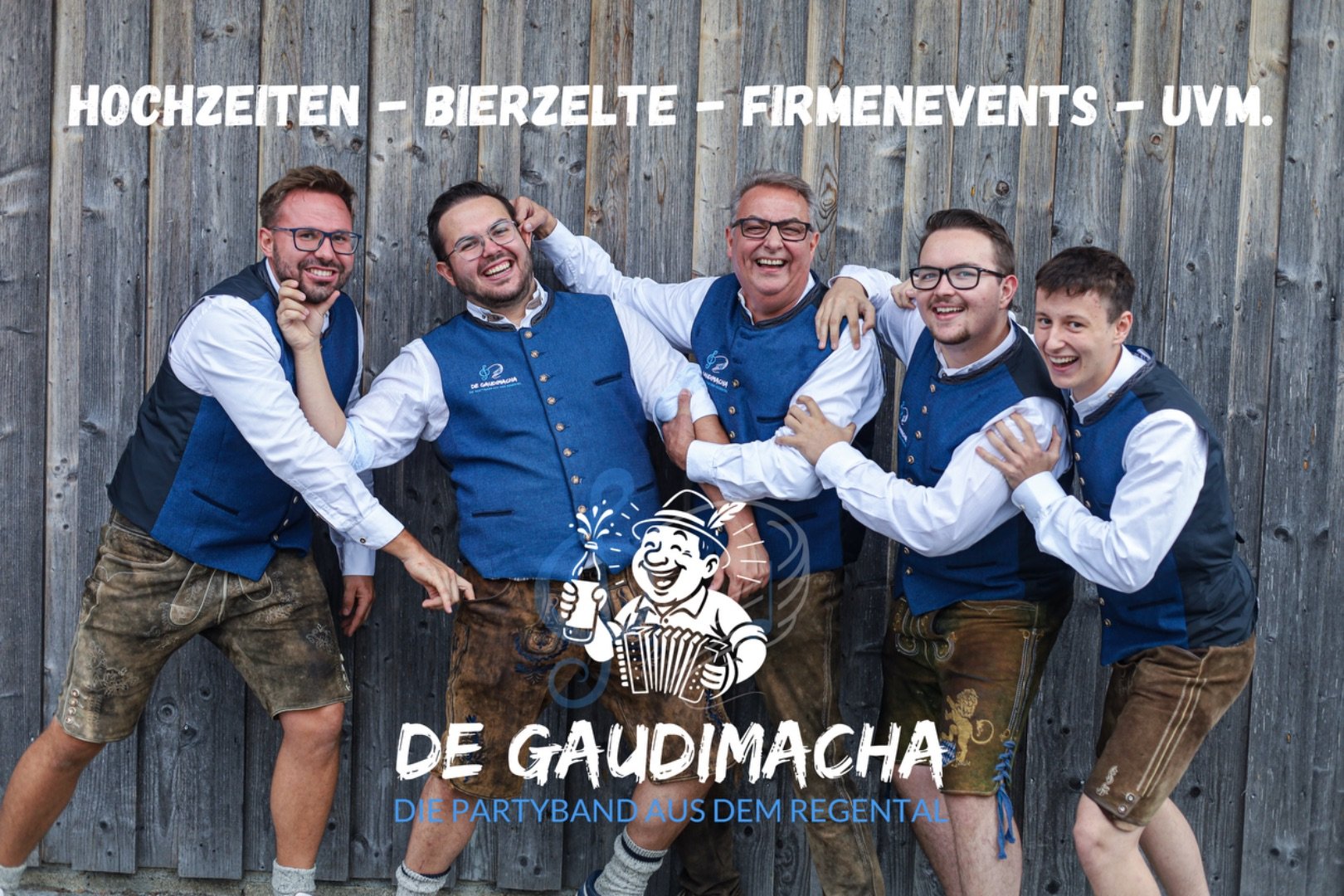 De Gaudimacha ist eine erfahrene Party- und Hochzeitsband, die mit mitreißender Live-Musik für beste Stimmung auf Hochzeiten, Firmenfeiern, Geburtstagen, Volksfesten und privaten Events sorgt. Unser vielseitiges Repertoire reicht von Party- und Stimmungsmusik über aktuelle Charts, Rock, Pop und Schlager bis hin zu klassischer Hochzeits- und Tanzmusik.