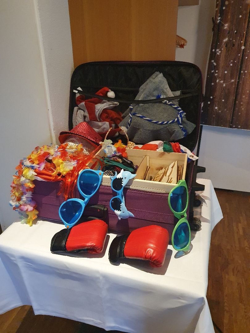 Verkleidungsbox mit verschiedenen Utensilien um die Fotos noch lustiger zu gestalten.